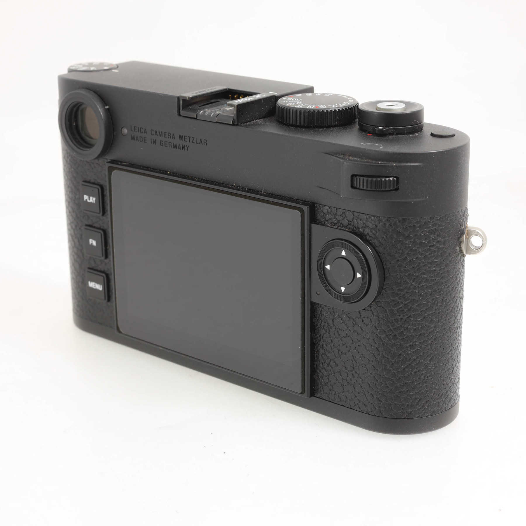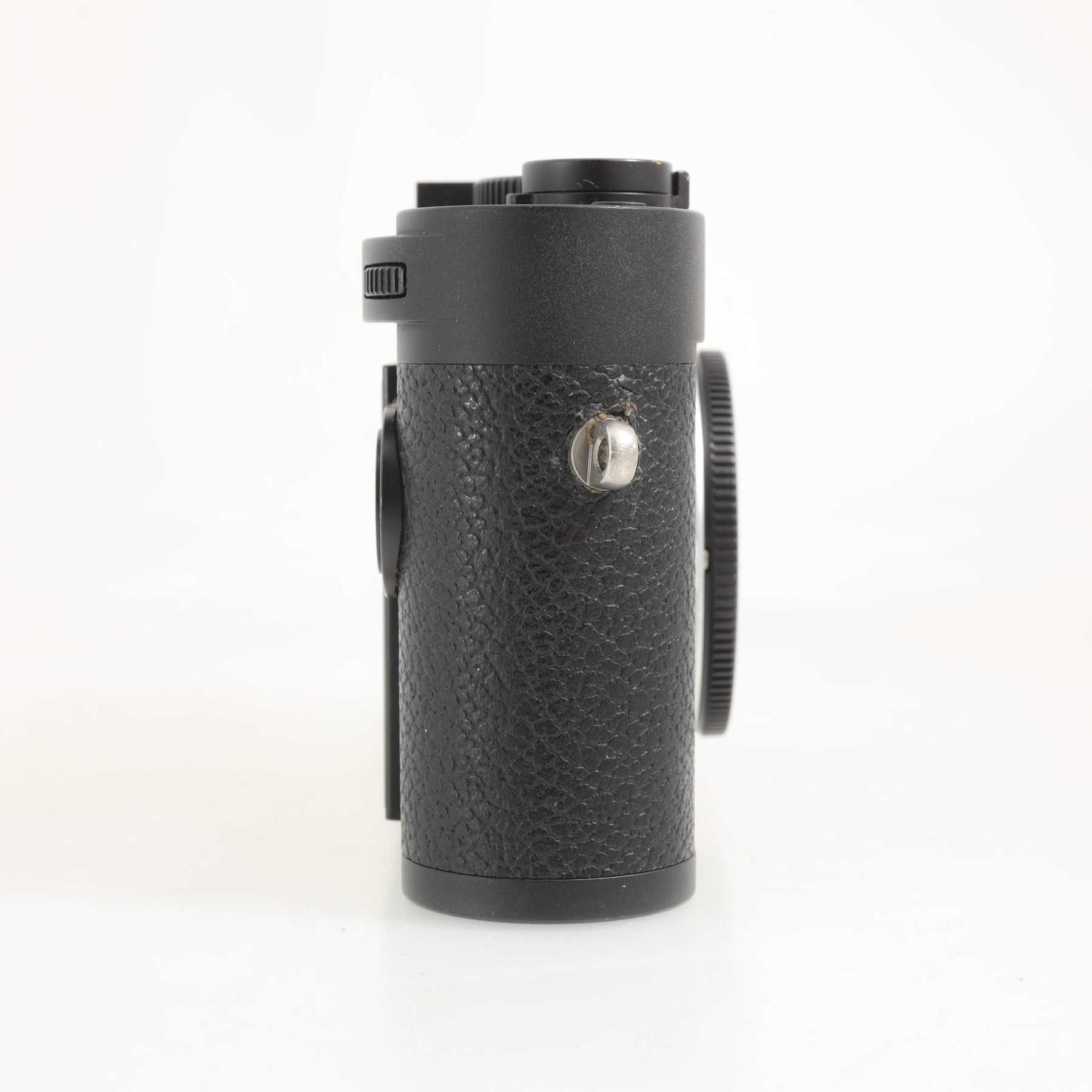 Незначительные потёртости байонета, горячего башмака (от установки видоискателя), рычажка включения и кольца вокруг спусковой кнопки (практически незаметны).Самая последняя модель в семействе дальномерных камер Leica M.