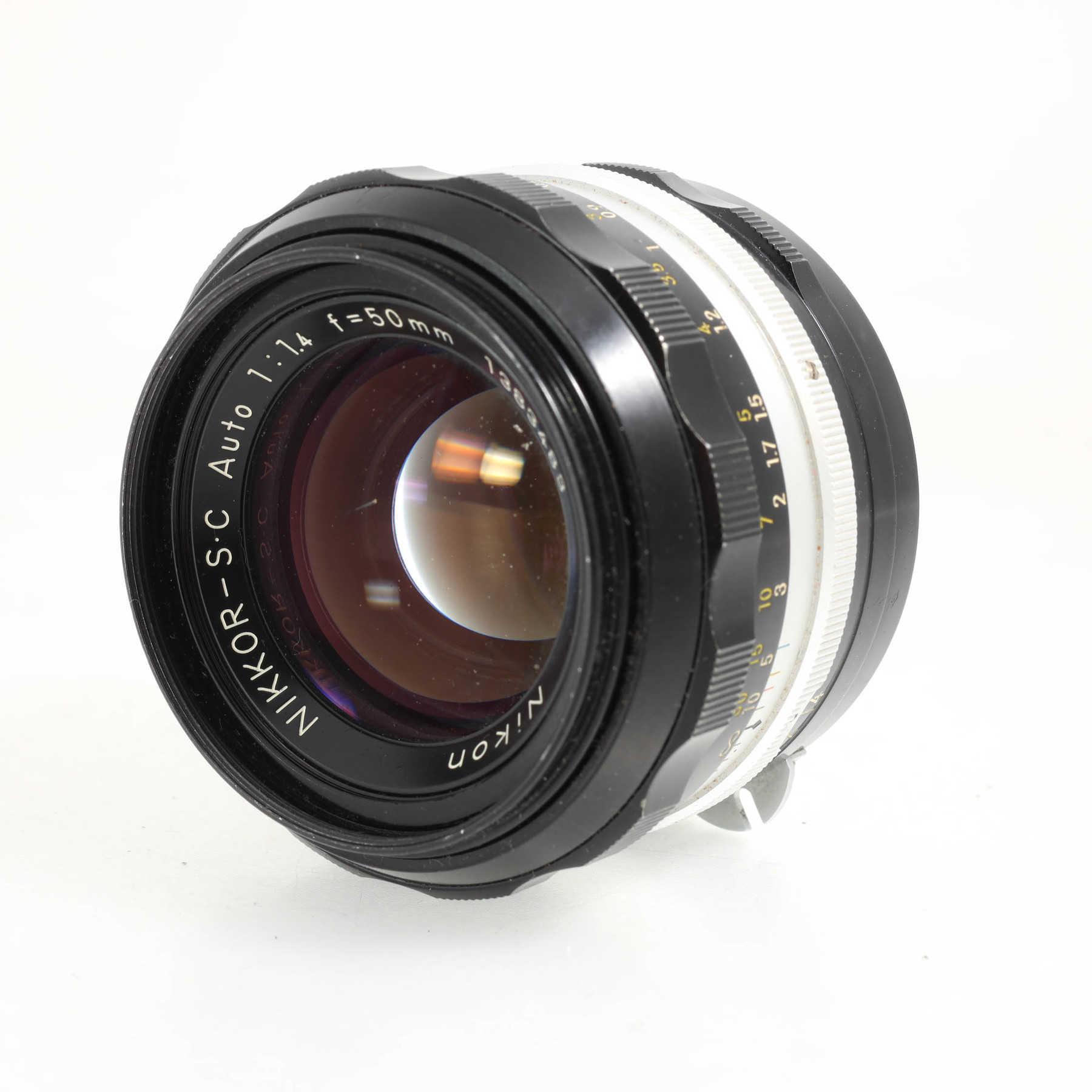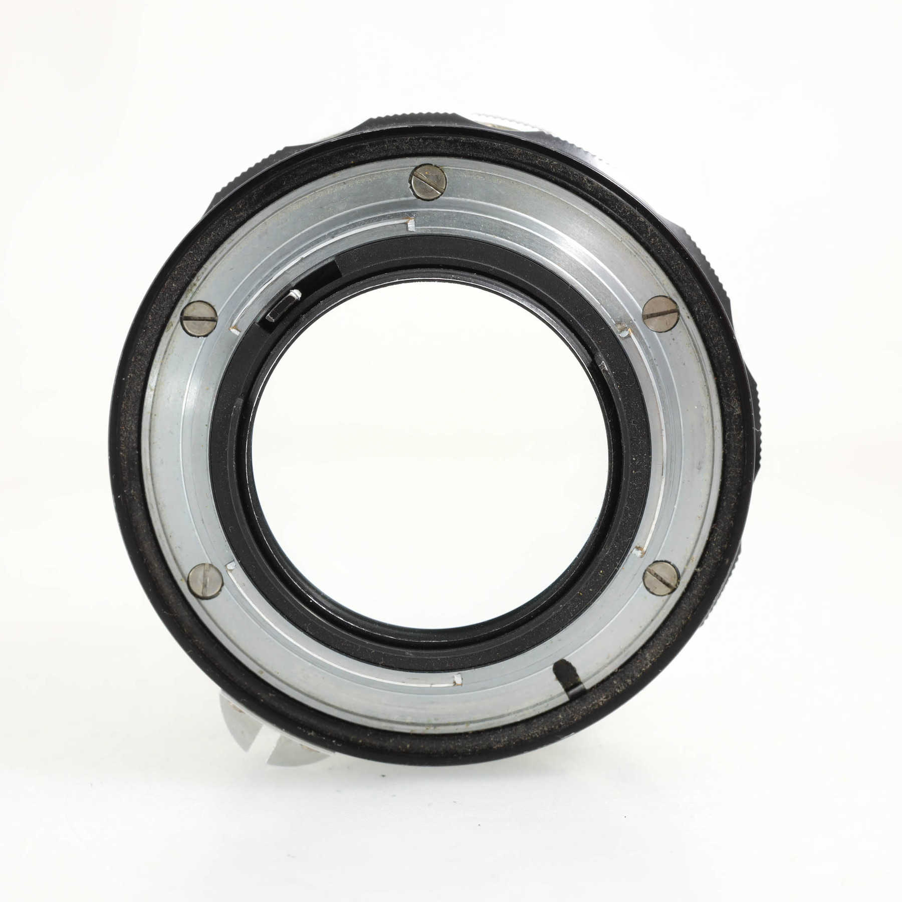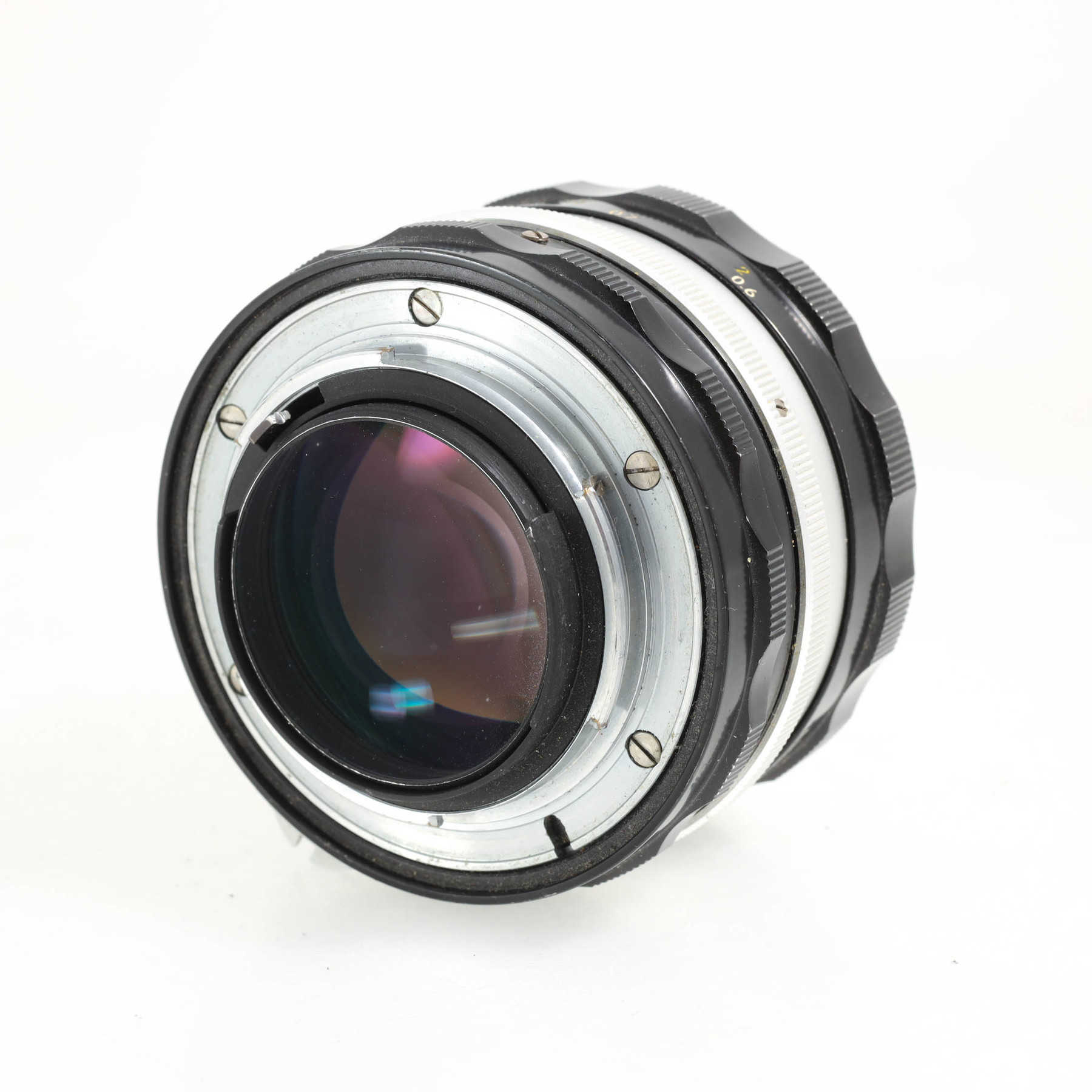 Потёртости оправы. На передней линзе небольшие точечные повреждения, в основном ближе к краю, минимально влияющие на изображение. Фокусировочное кольцо с плавным, но сухим ходом.Штатный светосильный объектив с ручной фокусировкой для камер с байонетом Nikon F и передачей значения диафрагмы с помощью поводка в камере и “заячьих ушек” (rabbit ears) на объективе. На более современных камерах, в том числе автофокусных, объектив можно использовать, но экспонометр работать не будет.