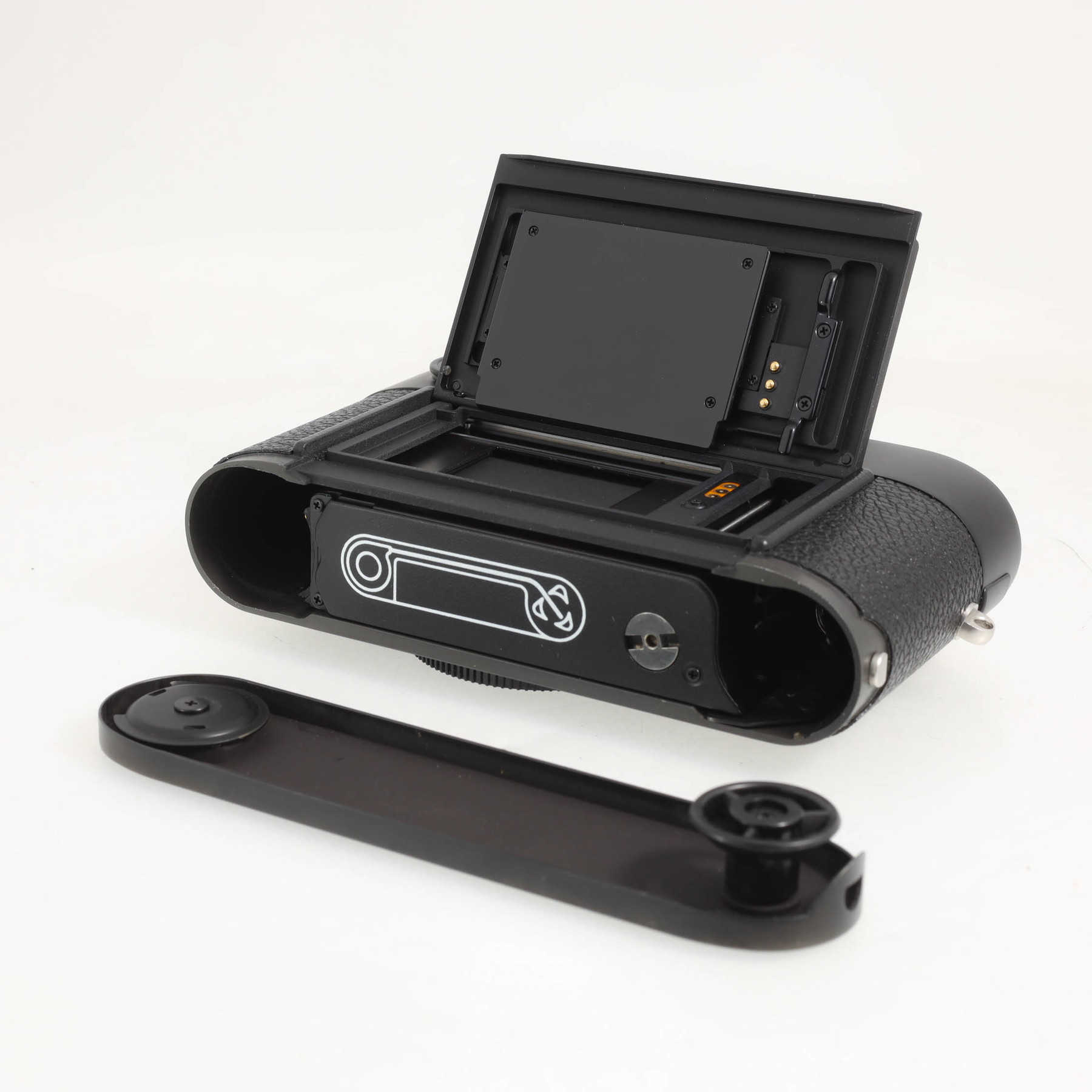 Небольшие потёртости до латуни на курке и рычажке включения камеры. В остальном идеальное состояние. На нижней крышке заводская защитная плёнка.à la carte — специальная программа Leica Camera, по которой клиент мог выбрать при заказе варианты оформления на свой вкус из нескольких предложенных.